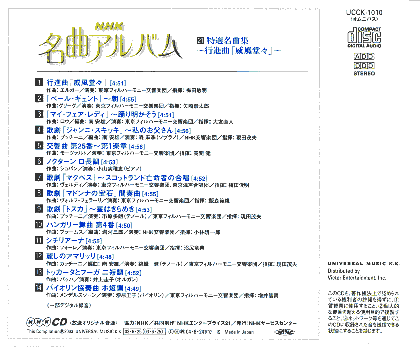 (2001. 7. 4.) NHK「名曲アルバム」は、7月9日と23日、総合テレビ10:55、教育テレビ12:25で放映されます。詳しくはこの番組のサイトをご覧ください。