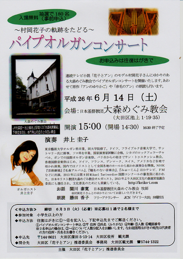 ゆかりの教会で、大田区「花子とアン」推進委員会主催の<オルガンコンサート>が開催されることになりました。