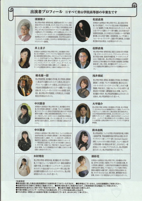 | 4/18(土) | 14:00 | 青山学院中等部礼拝堂 青山学院中等部第7回パイプオルガンコンサート 詳細は決まり次第お知らせさせていただきます。 |