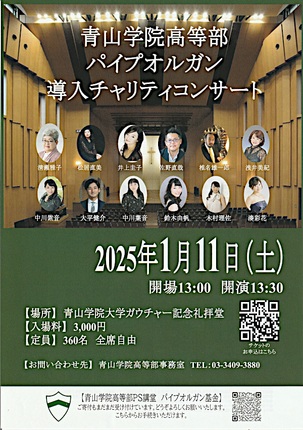 | 1/11(土) | 13:30 | 青山学院大学ガウチャー記念礼拝堂 青山学院高等部、パイプオルガン導入チャリティコンサート |