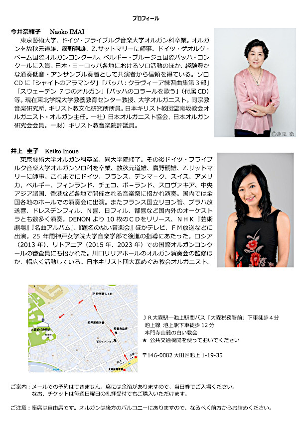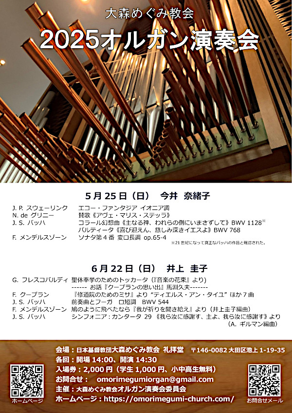 大森めぐみ教会 大森めぐみ教会 2025オルガン演奏会 クープラン“修道院のためのミサ曲より” バッハ“前奏曲とフーガ ロ短調” メンデルスゾーン“鳩のように飛べたなら(『我が祈りを聞き給え』より)” バッハ“シンフォニア 『我ら汝に感謝す、主よ、我ら汝に感謝す』” |