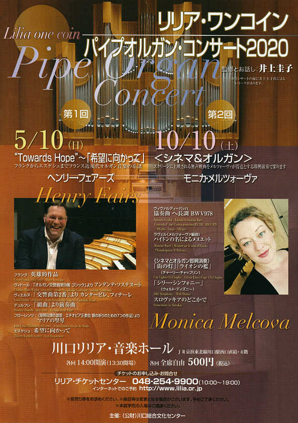 | 5/10(日) | 14:00 | (監修&プレ・トークに出演します) 川口リリアホール・ワンコイン・パイプオルガン・コンサートTowards Hope「希望に向かって」、 演奏:ヘンリー・フェアーズ ⇒出演者出入国が困難となり、中止(延期)となりました。 |