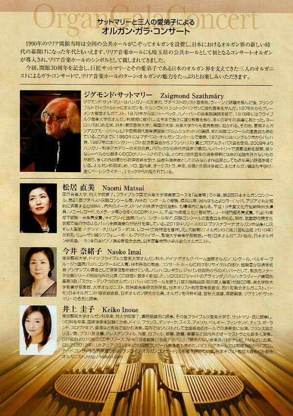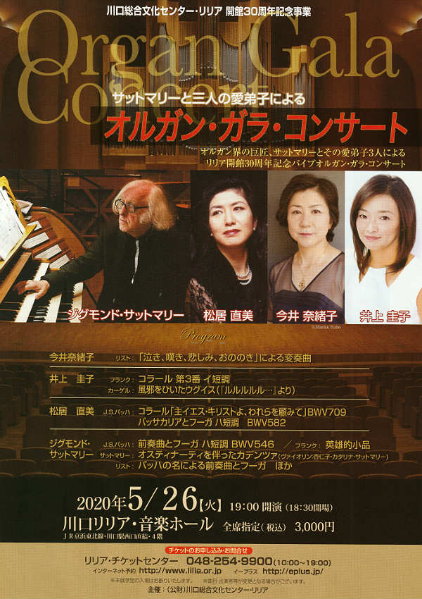 | 5/26(火) | 19:00 | 川口リリアホール・リリア開館30周年記念事業 『サットマリーと三人の愛弟子によるオルガン・ガラ・コンサート』、 ジグモンド・サットマリー、松居直美、今井奈緒子、井上圭子、 (井上・演奏曲目) フランク“コラール第3番” カーゲル“「ルルル」より風邪をひいたウグイス” ⇒感染症拡大防止のため、残念ながら中止(2023年6月3日に延期)となりました。 |