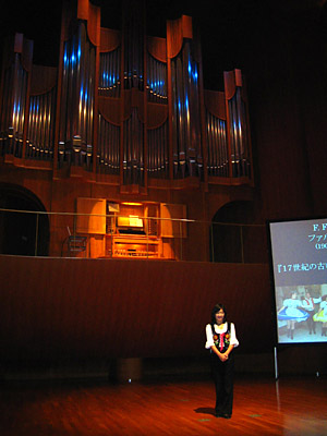さて初めて着るステージ衣装は、リハーサルに着用し、着心地をチェックするのが常です。 胸の前の赤いリボンで締め具合を調整。立っている時にぴったりだったのですが、演奏台に座った時には窮屈になり、 少し緩めることに。午後3時の会は無事終了。休憩中に一度衣装を脱ぎ、2回目の午後7時の会、再び着用してステージへ。 実際にオルガンの前に座ると、きつ〜〜い、しまった、緩めに着るのを忘れていた〜。 曲間で舞台裏に行こうか行くまいか、、頭をよぎり、、、そのうち、、、体に馴染んでいったのか慣れたのか、、、忘れて演奏していました。 そして、トークです。トークの最中に、頭が突然フリーズ状態に〜。話したことだったか、まだ話していないか、、、 7時の会は2回目のなので頭の中で混乱が起こったのです。こうしたプチ・ハプニングもありましたが、アンコールまで何とか無事終了。 客席から暖かいオーラを感じました、お聴きくださいました皆様、ありがとうございました。