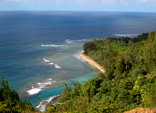 道がデッド・エンドになるケエ・ビーチの駐車場に車を止め、そこから断崖絶壁の山に沿った山道を片道2マイル(3.2キロ)