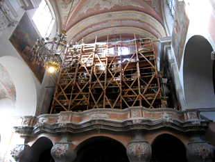 そして私たちは修復中のオルガンの中を通って演奏台へと案内されました。 オルガンケース正面には、「カスパリーニ」、「1776年」と刻まれ、そこにしっかりとカスパリーニ・オルガンが残っている事実を確認することが 出来ました。 椅子、ペダル鍵盤は当時のまま。古い形のストップ・ノブ。鍵盤は新しく修復し、幾つかの手鍵盤のストップだけ音が鳴らすことが出来、 少しですが音色も聴き、弾くことが出来ました。 2000年に始まった修復ですが、250年の年月を生き抜いてきた貴重な楽器の保存には、まだまだ時間と費用がかかるそうです。 世界中の著名なオルガン製作家、オルガニストの研究と知恵を集め、現存する唯一のカスパリーニ・オルガン、 貴重な歴史的な(大きな)楽器の修復プロジェクトが進行中です。 この文化遺産、いつの日にか完成する日が楽しみです。