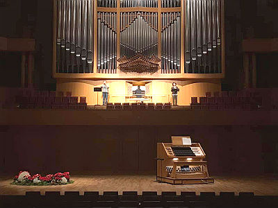 結局、最後のオペラアリア2曲と私のソロはステージで(右下の写真)、あとはオルガン本体の横で演奏しました。