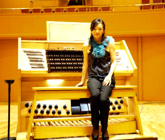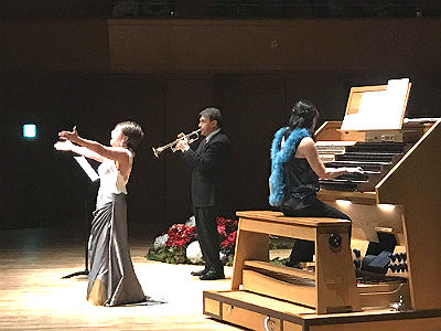 演奏会当日は、クリスマス・カラーの生花がバルコニーに飾られ、そして照明もクリスマス・カラーに(左上の写真)。共演者のソプラノの藤田美奈子さん、 トランペットのアンドレ・アンリさんと、曲ごとに色を選び、演奏しました。ソプラノ、トランペットとの響きも、美しく、 ブラボーの声も飛び、アンコールでは手拍子まで・・盛り上がりました。会場の皆様とクリスマス前のひと時を、音楽と共に喜びを分かち合えた演奏会となりました。 さて、ホールの天井が高く、オルガンが高い位置にある福島の音楽堂。音響はそれゆえ素晴らしいのですが、バルコニーまで、ステージからまずは木の急な階段を7段。 その後、さらに急で狭い螺旋階段を20段。しかもそれがステージ裏ではなく、ステージ上、つまりお客様から見える場所にあります。 階段を一気に登ると、息も切れる、、これですぐ演奏出来るのか、、。休憩をはさんでの前半と後半のプログラム、 私はずっと演奏台に居れば良いのですが、ソプラノの美奈子さん、トランペットのアンドレさんは何度も出入りをする、、。 私はパンツスタイルなので大丈夫だけれど、ロングドレスでヒールの美奈子さんはどうするのだろう、、。ドレスとヒールで 階段を昇り降り出来るのか、時間もかかるし、危険ではないか。プログラム(演奏順)を変更すべきか、、事前にリハーサルに行った時に この急な螺旋階段に気づき、主催者に相談すると、「これまで経験はない」、「プログラムの原稿締め切りは今晩まで」、と言う。慌ててマネージャーさんに電話。 しかしながら、「当日、現場を見て考えましょう」・・という返事だけで取り合ってくれない。ホールも「当日、出来る限りのことをします」と、、 誰も大変なことだと考えず、私一人、眠れなくなるような日を過ごすことに。 前日、皆で現地入り。オルガンの影に客席から見えない待機場所はあり、そこで座って待っていることが出来ることが判明。しかしながら オルガンを実際弾いてみると、オルガン横、あるいは裏は大音量になり、耳栓でもしないと待っていられないことも判明。 プログラム前半の私のソロは、大音量にはならないので、待機は可能。しかしながら、後半に演奏する私が演奏するハキムの現代作品は 迫力あるTuttiの連続、オルガンの脇での待機は無理。昇り降りするのか、耳栓をして待機するのか、 決まらないうちに前日のリハーサルは終了。