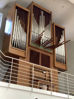弾いた曲・・私の人生の大切な節目に弾いた曲です。クリスマス疲れもある中、そんな大曲にまた向かった私。 さて、めぐみ教会のオルガンは、1970年シュヴェンケーデルによって製作(整音はシュタインメッツ)完成した、フランスバロック様式のオルガンで、 当時日本に初めて入ったフランス製のオルガンでした。2段鍵盤とペダル、18ストップ。木造の旧礼拝堂でもとても 美しく歌う楽器でしたが、解体され、礼拝堂建設の4年半、教会内の倉庫で大切に保管されていました。 昨年夏に倉庫から忍野にあるガルニエの工房へ運ばれ、古く傷んだ部分は修復され、そして11月になって完成した新礼拝堂へ再び 運び込まれ、一部は礼拝堂内での作業で修理され、12月半ば、組み立て完了。一応、音は出るようになったものの、 整音未完のままでクリスマスを迎え、 マルク・ガルニエ氏による整音が終わったのは1月15日。以前のような美しい響きの礼拝堂になればと願う中、 完成したのは残響3秒、人が入って2秒という、以前より豊かな響きの礼拝堂。そしてマルク・ガルニエの手により、新会堂の響きに合った音に再整音、そして より一層美しく鳴るオルガンとなって復元されました(良かった&涙・・)。5年ぶりにオルガンと再会です。
