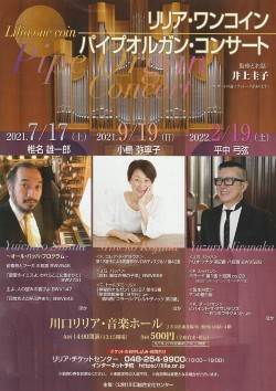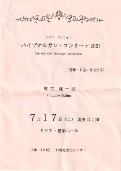 川口リリアホールでの『ワンコイン・パイプオルガンコンサート』、海外から演奏家をお招きし企画していましたが、3回の演奏会が 中止や延期になってしまい、昨日はなんと1年10ヶ月振りの開催でした。 久しぶりの開催にふさわしく、バロック音楽の大家であり、オルガン音楽の原点でもあり、バッハ無しではオルガン音楽は語れない、、そんなJ.S.バッハの作品を存分に お聴きいただく企画になりました。 演奏者には日本若手オルガニストを代表するお一人、またバッハ全曲演奏などスペシャリストでもある椎名雄一郎さんをお迎えして。 緊急事態宣言下の東京を南から北へと縦断し、ホールへ向かう私。梅雨も明け快晴の夏日、感染者数も増えているし、オルガンを聴きに、、果たしてお客様はいらしてくださるのか、、 など心配も胸に車を走らせました。 椎名さんのリハーサル、最後まで念入りなストップ選びやタッチの確認に時間を費し、繊細なタッチから美しく素晴らしい音楽が紡ぎだされていく。ホール中央に座り、降り注ぐ音、 体全体に音のシャワーは最高の心地。演奏台では、実はこんな音は聴けないのです。そして自粛生活で毎日オルガンを弾いている私ですが、 このオルガンの音に全身を包まれる感覚は久しぶり。椎名さんの美しく、繊細であり、そして迫力の演奏を聴き、これはお客様に一押しの演奏会になると一層強く確信する私でした。 演奏前に短いトークがあったので、私はステージ袖にあるモニターで会場の様子を見ていたのですが、そして迎えた開演時間、ホールは満席に! 1席も余すことなくいっぱいに埋め尽くされた客席、そしてホールのスタッフからの指示通り、お喋りもせず静かにコンサートの始まりを待っていらっしゃるお客様。 50%の制限かと思っていた私ですが、ホールスタッフに尋ねると、無言で聴くクラシックコンサートは100%の集客も可と行政から指導を受けているとのこと、納得。 とはいえ舞台スタッフもモニター画面を見て「こういうの、久しぶりです」・・と小声で。