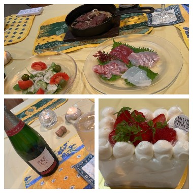 オルガン弾いて、泳いで、踊って、飛び跳ねて(笑)、特に変わり映えもしない普段のことになりました。 いかに日々、好きなことをして過ごしているかがわかります。暑い夏は、オルガンを弾いて暑くなると、マンションプールに飛び込み、冷却、リラックスしています。 第7派のピークの今、外食は避け、でもSpecial Dayということで、プレゼントでいただいたシャンパンをあけ、 上質なステーキと(手のかからない)お刺身などなど、そしてBirthday Cakeとで、ささやかなお祝い、プチ・バースデーパーティとなりました。