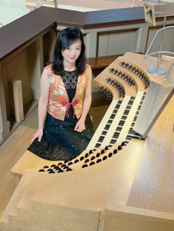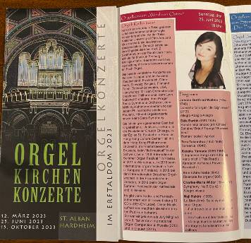 彼らとは留学時代からの友人、あの頃、小さかった息子さんのヨハネスも、可愛い二人の女の子のお父さんに。フロイゲルス・オルガンの社長さん、立派に成長し、 オルガン製作に忙しくしていました。 ミルテンベルクがあまりに綺麗で可愛い街なので、リハーサルの合間に、街を散策したり、お城へ登ったり、家族みなで食事に行ったり、 ドライブしアイスクリームを食べに行ったり、マイン川辺に沈む夕日を見たり、気候も暑くもなく寒くもなく快適、時差ボケを解消しつつ、演奏会までの時間を過ごしました。 演奏会は隣町、ハルトハイムの中心にある教会で。オルガンはフロイゲルス・オルガン(3段鍵盤とペダル、48ストップ) 。残響も長く、とても弾きやすい楽器で、魚が水に返った感じ、楽しみました。 「Wind von Osten」(東からの風)というテーマで演奏を頼まれたので、邦人作品、日本歌曲の編曲、ハンガリーのバルトークも入れてのプログラム、日本を意識し、母の帯を直した衣装で演奏。 演奏前に挨拶をするように言われ、困った、、与えていただいた機会に感謝をと思い、拙いドイツ語で挨拶し、演奏へ。 演奏会後は、スタンディング・オベーション、暖かい拍手をいただきました。演奏も、それから挨拶も良かった、と(-_-;)こうして一公演目は無事終わり、 ドイツで一番古いと言われている(そうしたホテルがフライブルクにもありますが、、)ミルテンブルクのホテルRiesenのレストランで、美味しいドイツ料理と地元のビールで乾杯。