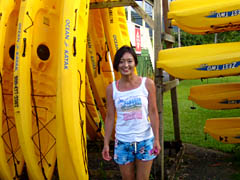 しかしながらコックピットのように狭い所にずっと同じ姿勢で、しかも日頃使う(鍛えている?)筋肉とはまた違う筋肉を使い、 パドルからしたたる水は体にかかりびしょ濡れに、、、決して優雅なものではなく、これもスポーツだなと思わされました。 写真を撮っている余裕などはほとんどなかったのですが、カヤックの上からのショット(左の写真)と、 お疲れ様〜のショット(右)です。