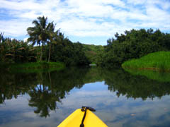 今年もお気に入りのハエナ・ビーチへ。 海に入ると、いろんな色の魚達がいっぱい〜。群れをなして泳ぐ小さな魚たち、 カラフルな縞模様の魚、うなぎのような長い魚が岩の間に姿を現したり、、お魚たちと一緒に泳ぎました。 時にはスカーリングする手がお魚に触れたり、また時にはお魚と目が合うことも! まるで自然がつくった水族館の水槽の中にいるかのよう。海の中は別世界、日常生活から離れ、リラックスできる時間です。 ビーチも楽しんだのですが、今回は初めてトレッキングとカヤックに挑戦。 カウアイの北海岸ハエナ・ビーチの先は、行き止まり。そこから先は車も入っていけない秘境地域、『ナ・パリ・コースト』 (ハワイ語で断崖絶壁の意味だそう)です。 山の向こうにある景色を一目見たいと、デッド・エンドに車を停め、そこから山歩きをすることに。 雨の多いこの地域は緑が豊かでまるでジャングル。 狭く険しい登山道を歩くこと約1時間、急に視界が開け、海、そして断崖絶壁のワイルドな景観が! どこまでも続く海、明るい太陽の光。ダイナミックな地形とのコントラストに思わず息を呑みました。 大自然、そしてその雄大さに感激!この先はキャンプ道具を持参しての泊りがけのコース。軽装で来た 私はここで引き返すことに。カウアイの自然は奥が深いとまた新たな魅力を知るのでした。